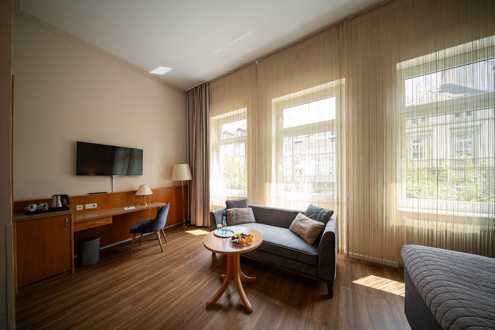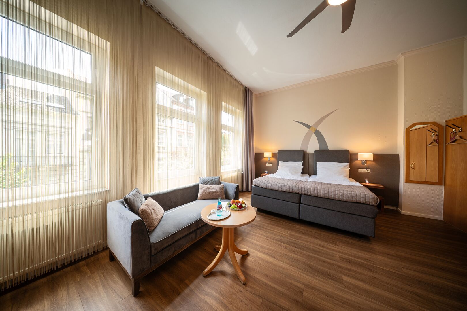Zusätzliche Annehmlichkeiten: Ein Zimmersafe für Wertsachen, ein Kühlschrank sowie ein Wasserkocher oder eine Kaffeemaschine sind im Komfortzimmer vorhanden. Für den schnellen Genuss stehen Teebeutel und Kaffeepads zur Verfügung. Der Spiegel und ein großzügiges Beleuchtungskonzept machen den Raum zusätzlich einladend.
