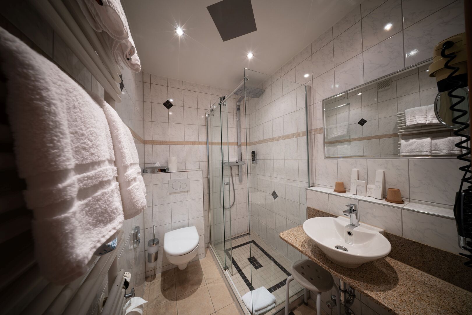 Badezimmer: Das Badezimmer ist ein Highlight des Komfortzimmers, mit hochwertigen Materialien im edlen Design. Sie finden Pflegeprodukte wie Shampoo, Duschgel und Handseife. Große, weiche Handtücher und ein Föhn bieten zusätzlichen Komfort.