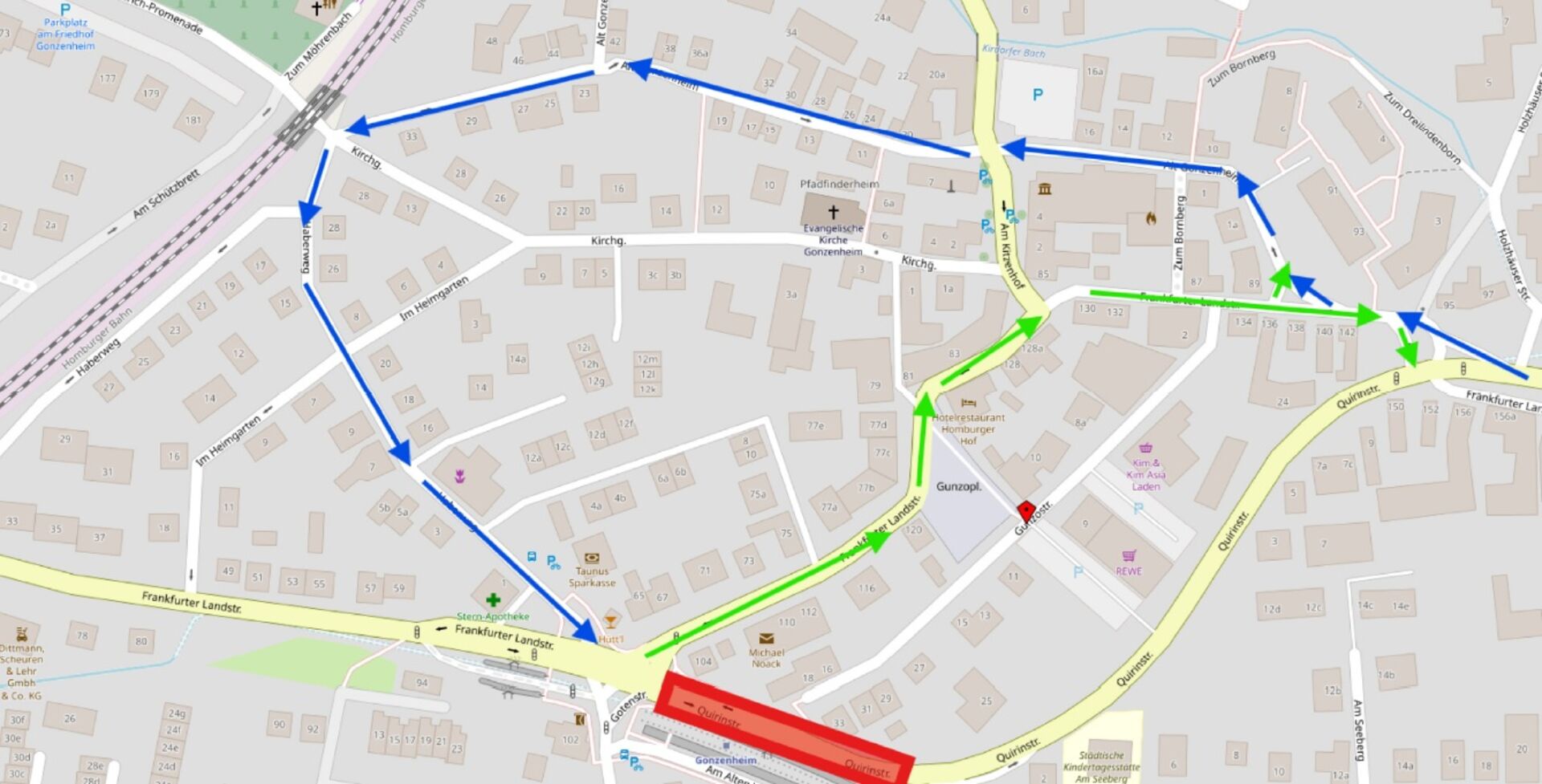 Der Verkehr in Richtung Innenstadt wird über die Straße Alt-Gonzenheim und den Haberweg umgeleitet. In diesem Zusammenhang wird die Einbahnstraßenregelung in der Straße Alt-Gonzenheim zwischen Friedrichsdorfer Straße und Kaiser-Friedrich-Promenade entsprechend angepasst. Auch im Haberweg zwischen Im Heimgarten und Frankfurter Landstraße wird die Fahrtrichtung der Einbahnstraße vorübergehend geändert.